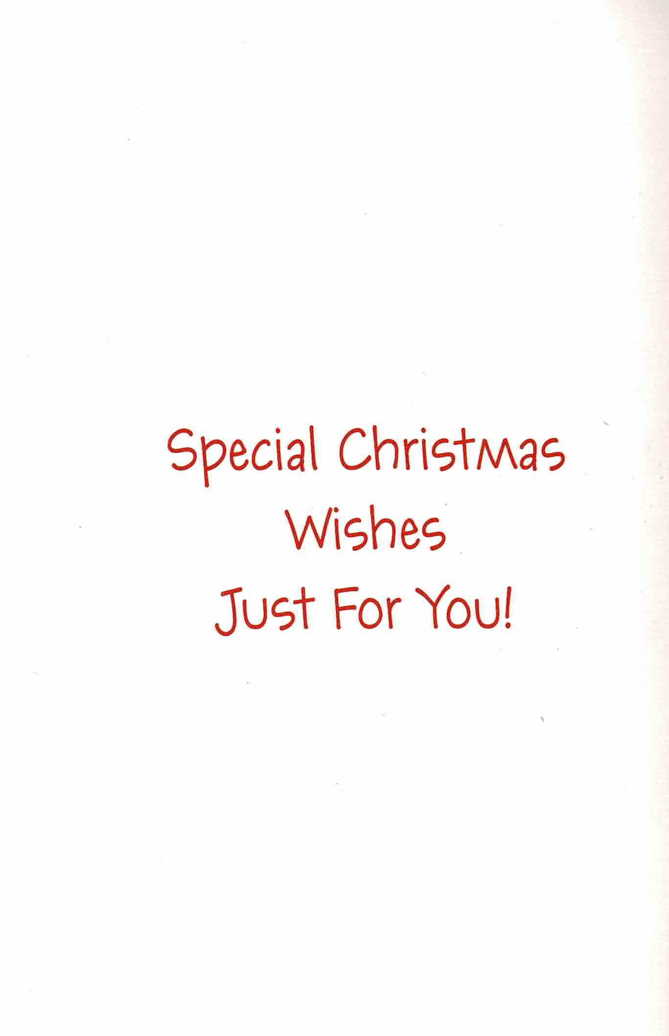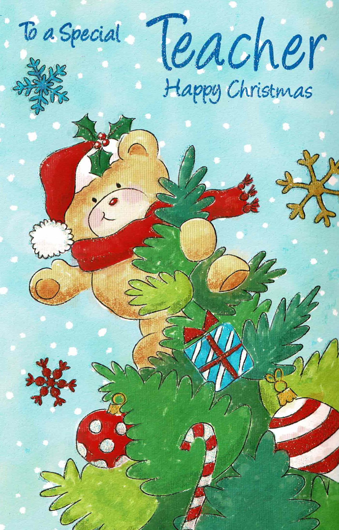 A lovely, simple Christmas card for teachers with a happy bear holding on to a Christmas tree.