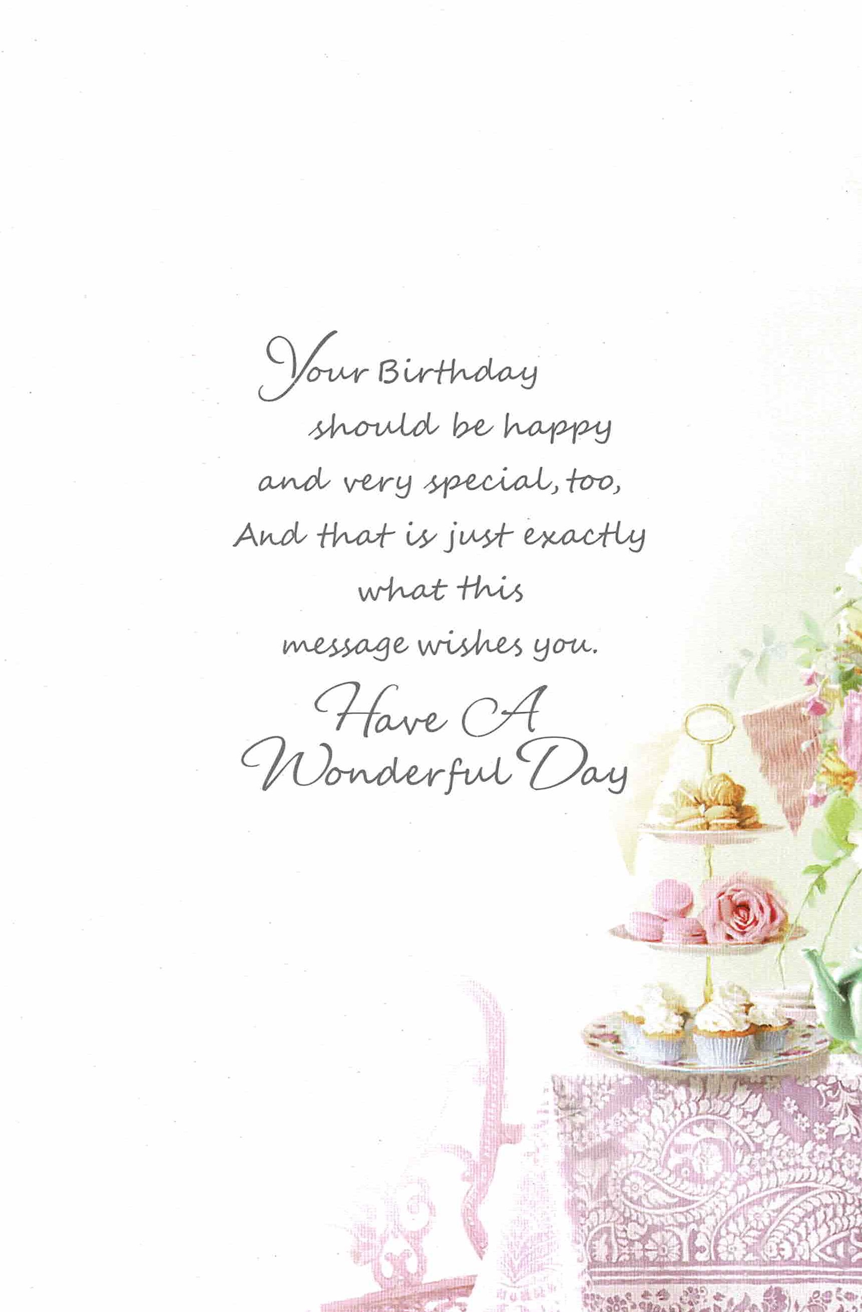 A floral, sparkly afternoon tea themed card.