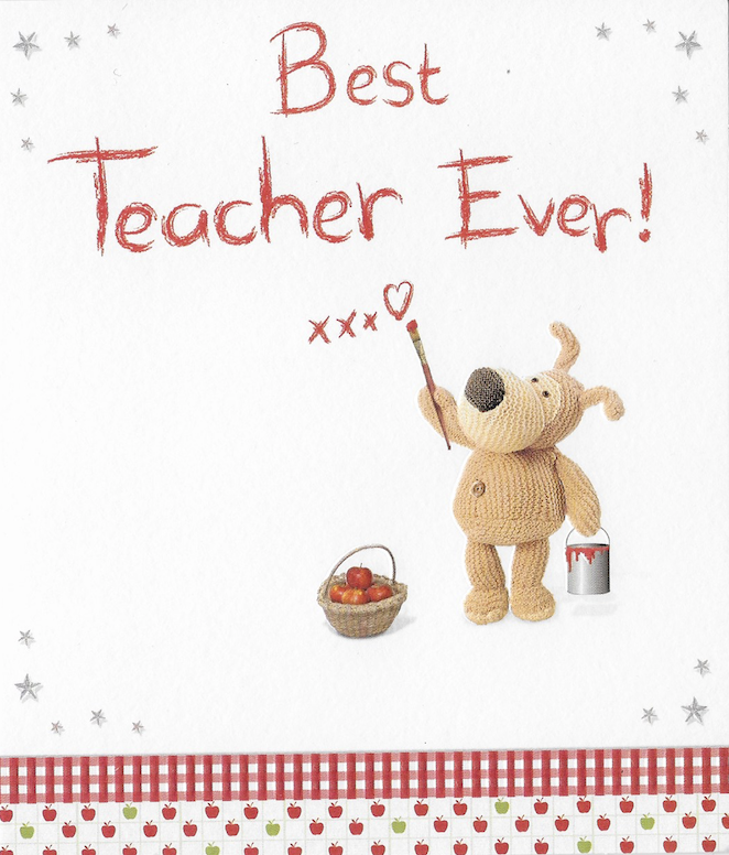 Best Ever Teacher card with snuggly bear and apples for sharing.