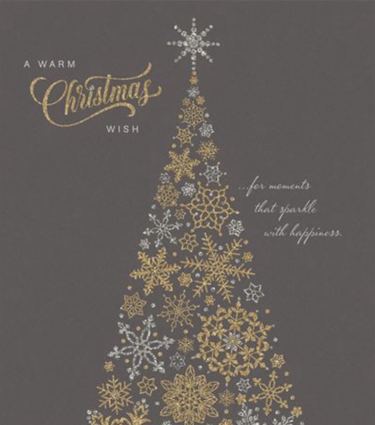 A beautiful glittery, festive greeting card with a silver and gold glittery tree.