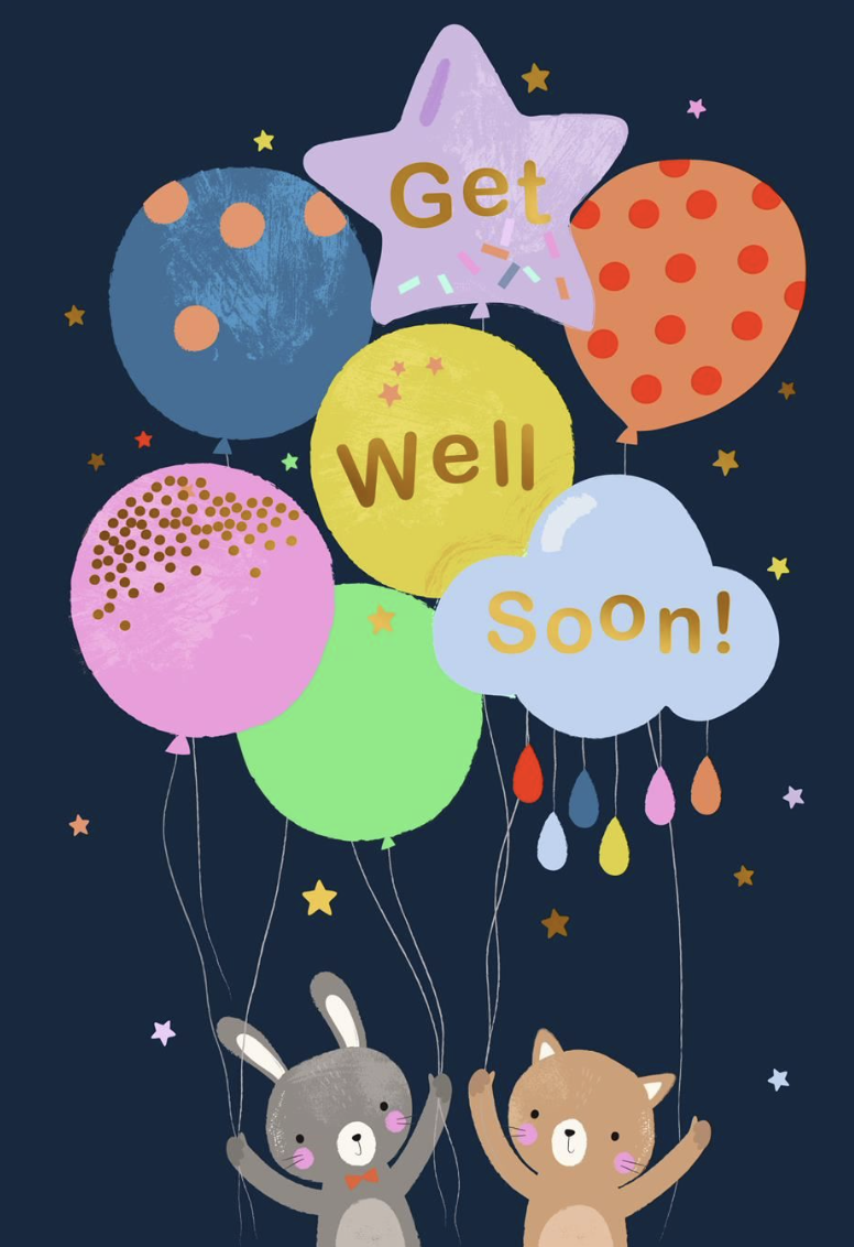 A simple, uplifting get well soon card with gold writing on a dark blue background. The inside lime green in colour.