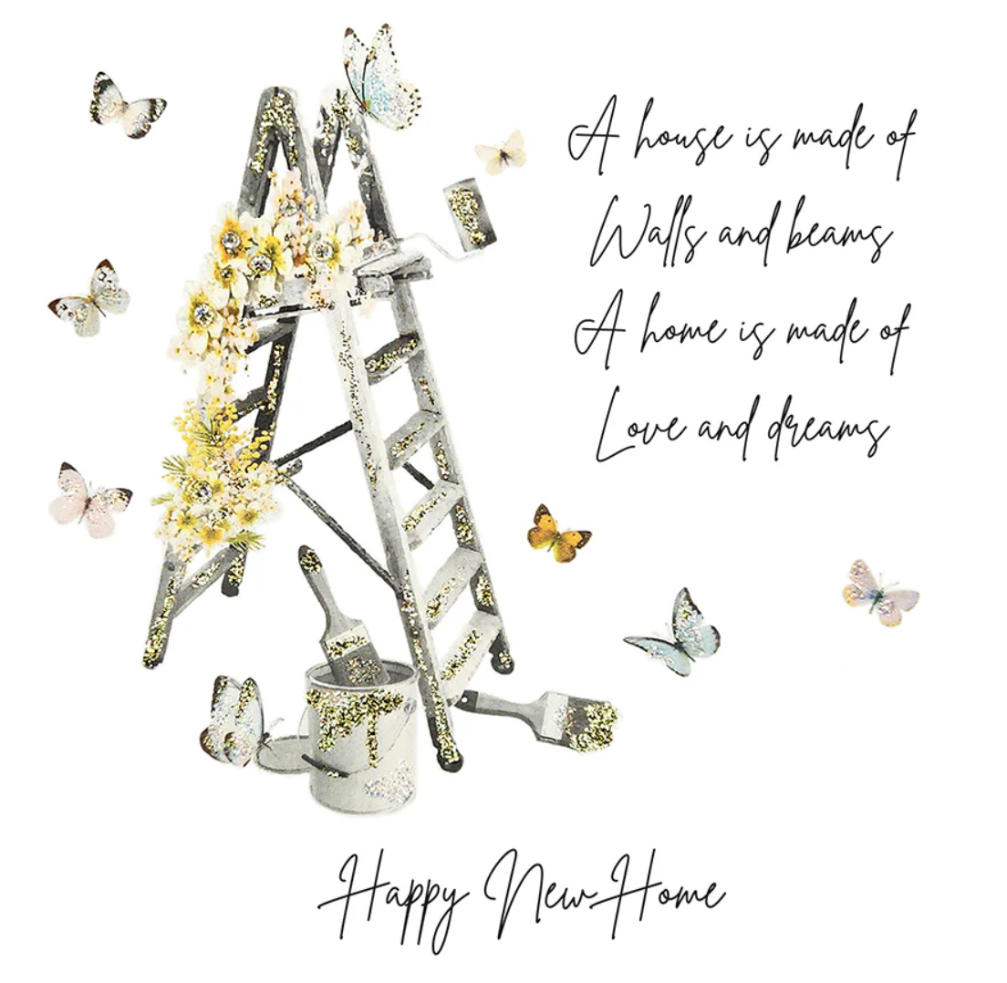 A beautifully sparkly cards filled with the new home decorating spirit and embellished with glitter and crystals.