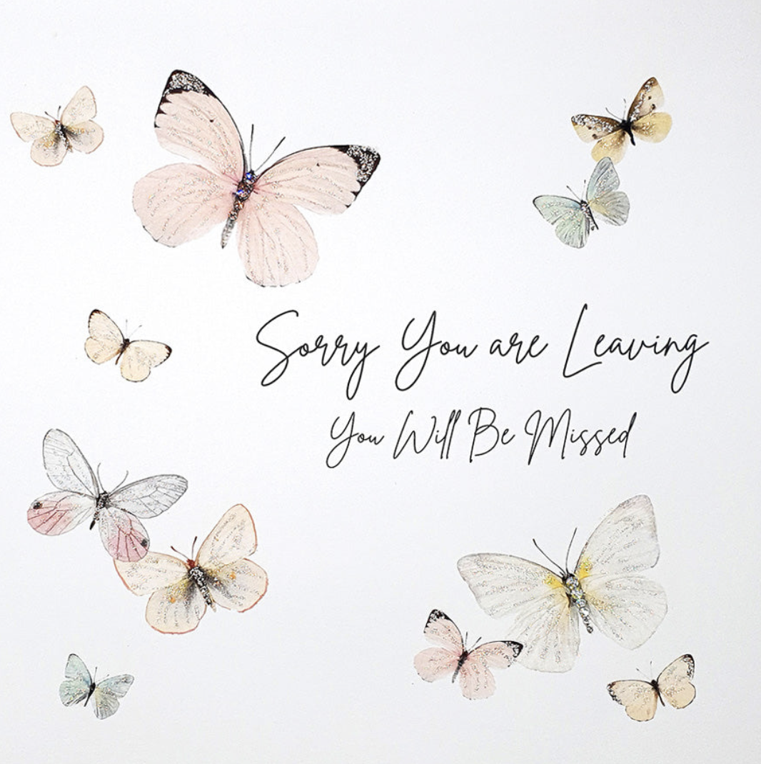 An elegant leaving card with a selection of beautiful, glittering butterflies and delicately placed crystals.