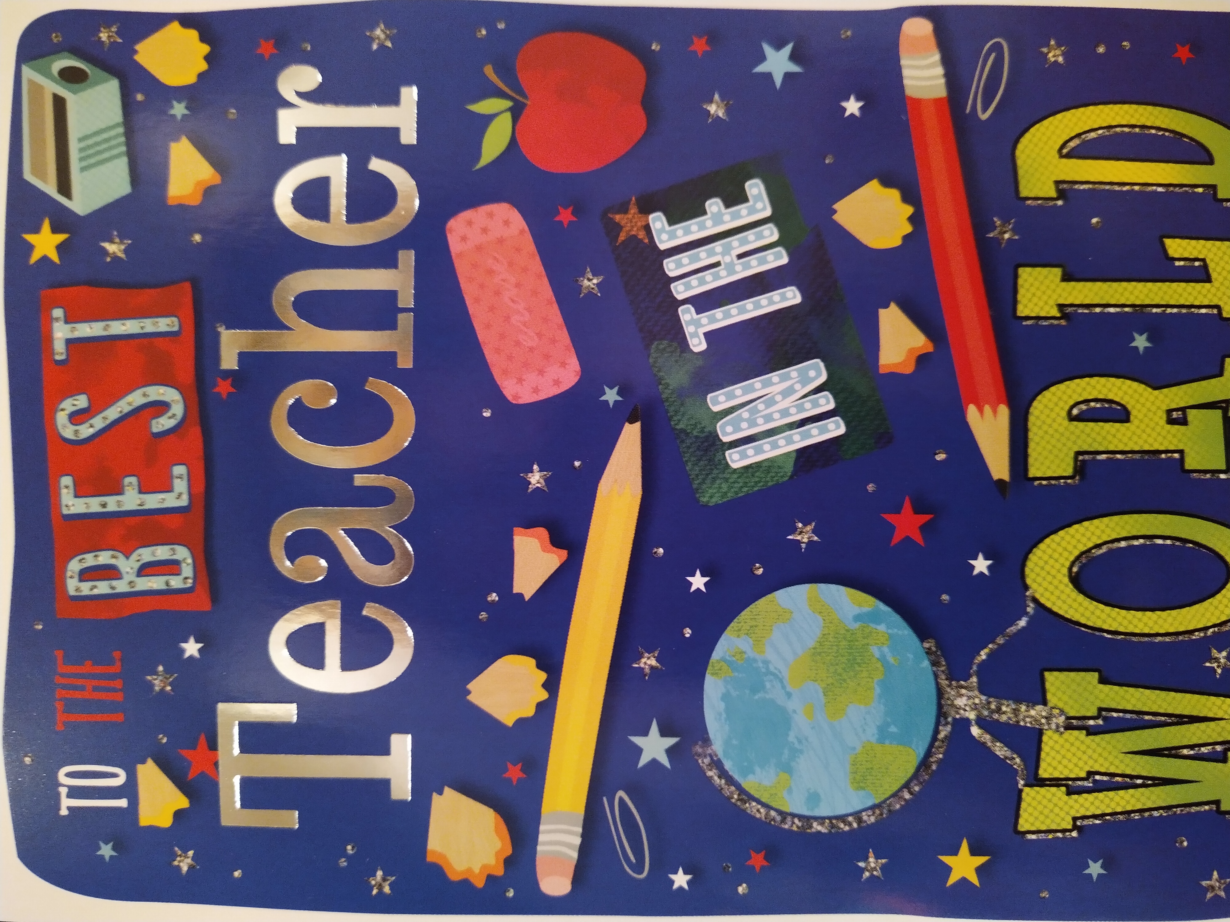 A space themed teacher thank you card, embossed with silver foil.