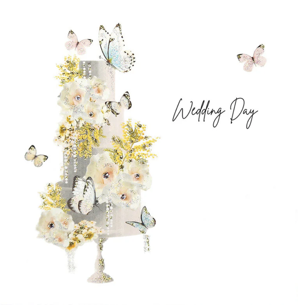An elegant wedding day card on shimmering paper featuring purposefully placed diamantés.