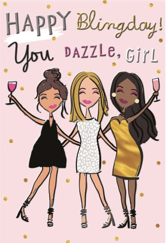 An uplifting, jovial birthday card for the ladies with gold detailing.