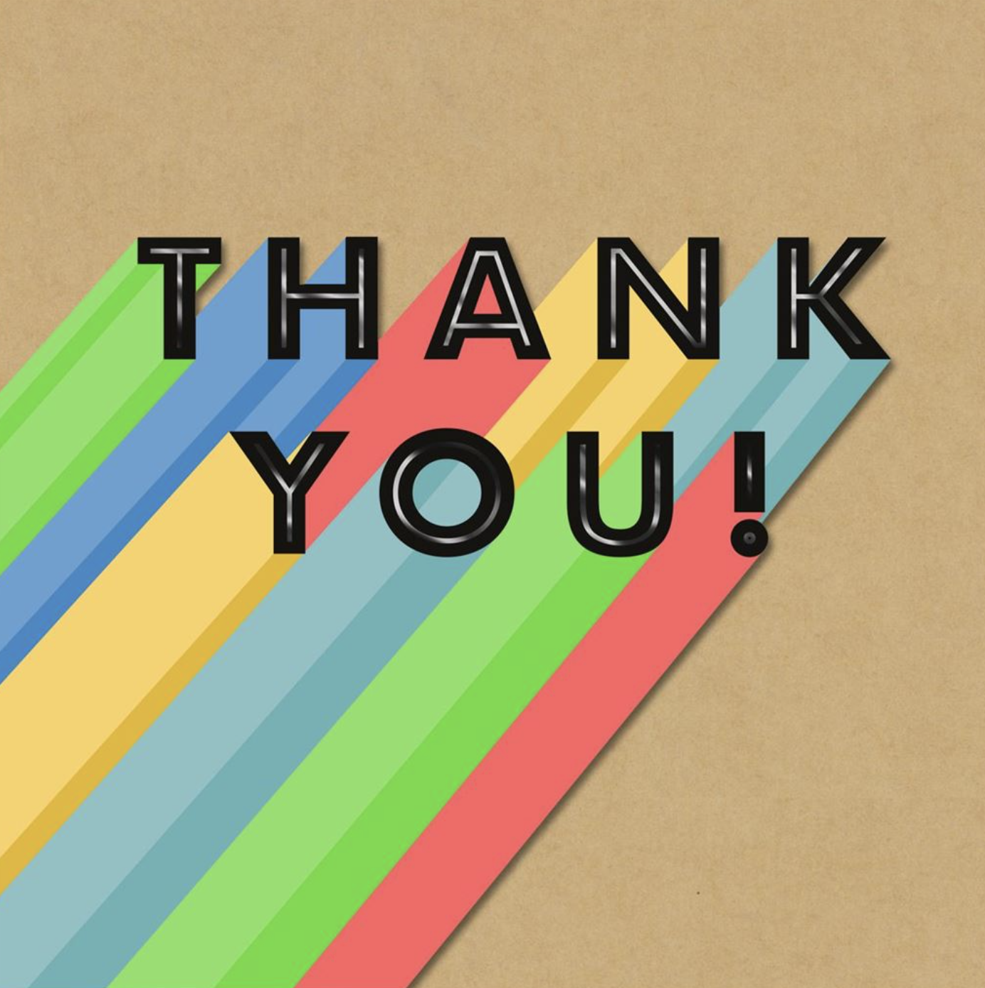 An embossed thank you card with a multitude of colours.