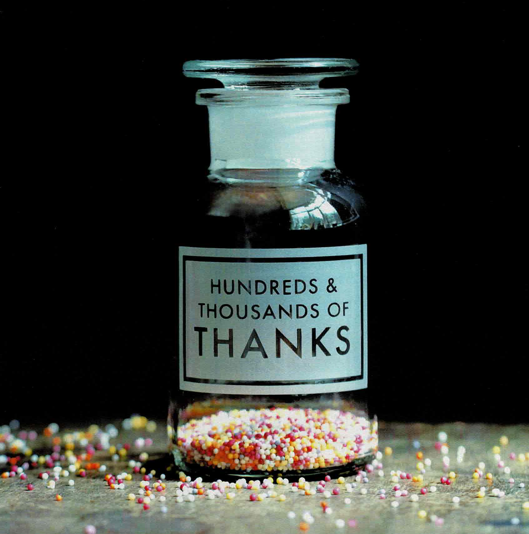An elegant jet black card featuring an old school chemistry bottle of sweet sprinkles.